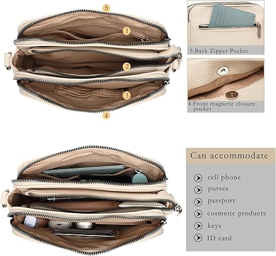 - Exterior Design: This women’s shoulder bag features 4 zippered pockets and 1 pocket with a magnetic buckle. The middle pocket serves as the main compartment, with a front pocket secured by a magnetic buckle and a zippered pocket with 4 card slots. At the back, there are 2 zippered pockets, one of which includes a small interior pocket. Ideal for carrying essentials like your phone, wallet, and other daily items.
