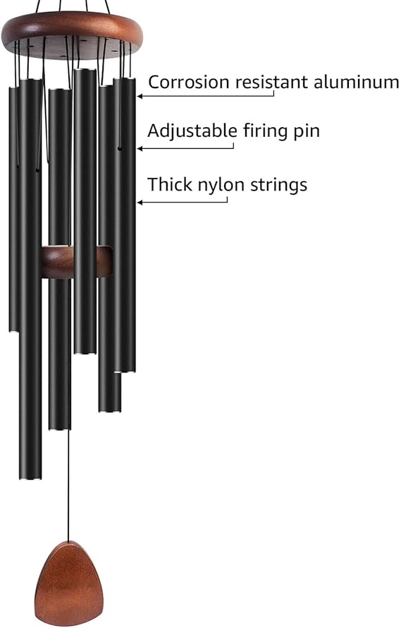 - ♪【Bigger and Better】The wind chime is made of aluminum pipe and pine. The total length of the wind chime from the top’s S-shaped hook to the bottom’s catcher is 37″ Among them, six classic black anodized aluminum tubes have excellent corrosion resistance and wear resistance, and the length ranges from 8.7″ to 12.6″. The wood is made of wear-resistant and non-cracking pine. The adjustable wooden striker allows you to adjust your favorite position at will.