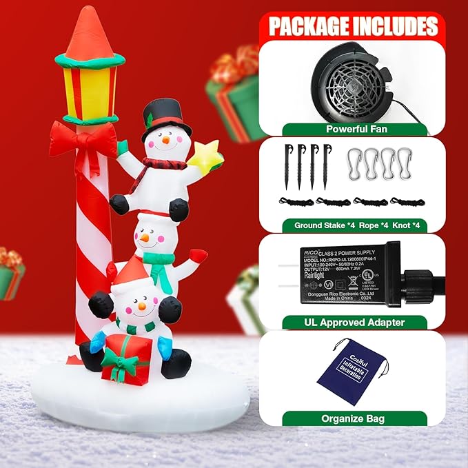 - Built-in LED Light: This lighted stacked snowman beside by street lamp measures 7 ft tall and has built-in 8 bright LED lights that light up in the christmas eve for the best attraction to neighbors and guests.