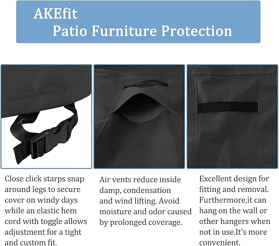 - 【Windproof design】The bottom of the outdoor furniture cover has four buckle straps and two windproof drawstrings to prevent it from being blown away by the wind. Vents and handles are designed on the sides to provide breathable and moisture-resistant outdoor table covers.2 handles makes it easy to set up/remove.