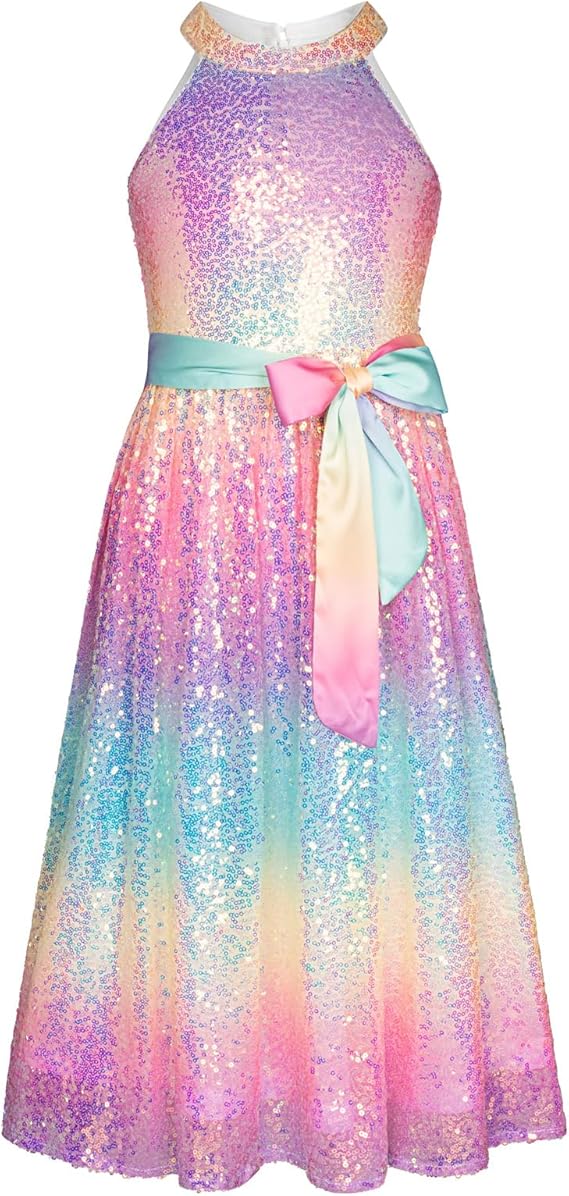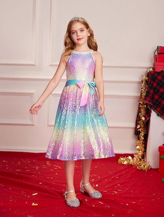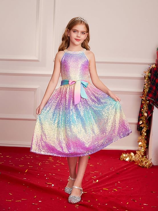 - Design Features of the Girls Sequin Dress: Our girls’ sequin dress not only uses shiny materials, but also has a full lining, making it comfortable and beautiful. The dress hem creates a fabulous spinning effect. It comes with a fixed satin waistband that can be tied in the back or front, forming a cute bow.