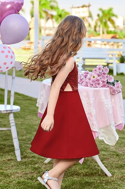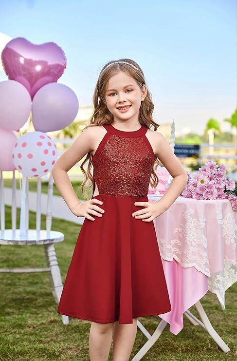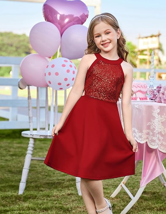- [DAZZLING DESIGN]:This exquisite party dress features a halter neck and hollow design on both sides of the waist,offering versatility and style for any special occasion.Adorned with shimmering sequins,the lined dress boasts moderate stretch for ease of movement,while the hidden zip at the back ensures a seamless look,making your girl sparkle with every step.