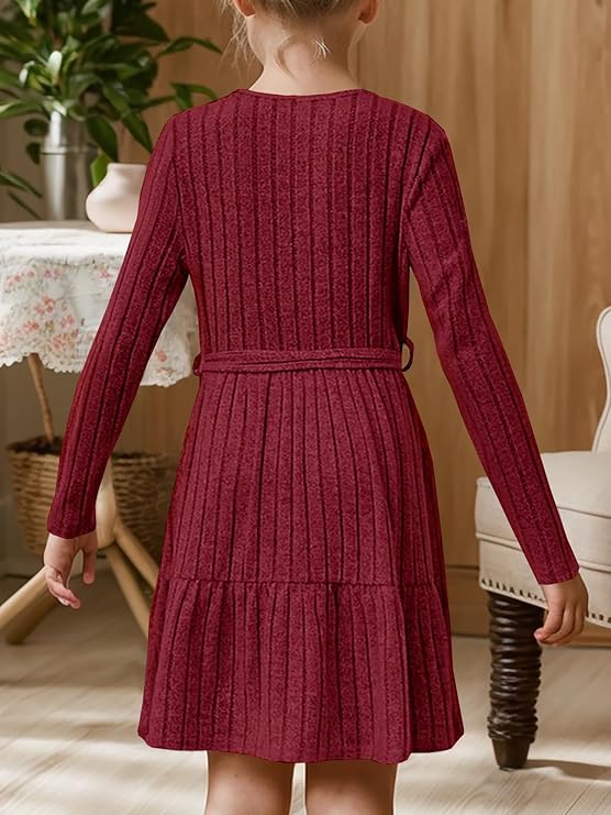 YOVION Girls Fall Long Sleeve Dress Knit A-Line Ruffle Tiered Holiday Casual Sweater Dresses with Belt for 6-12 Y