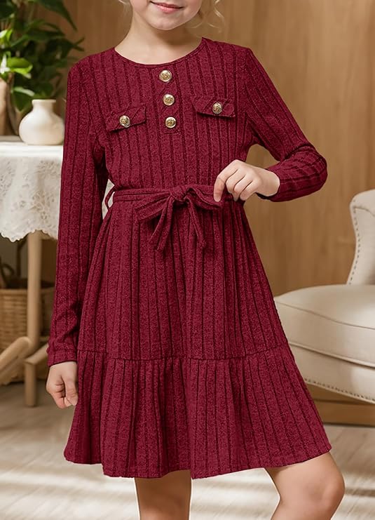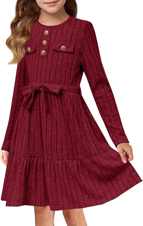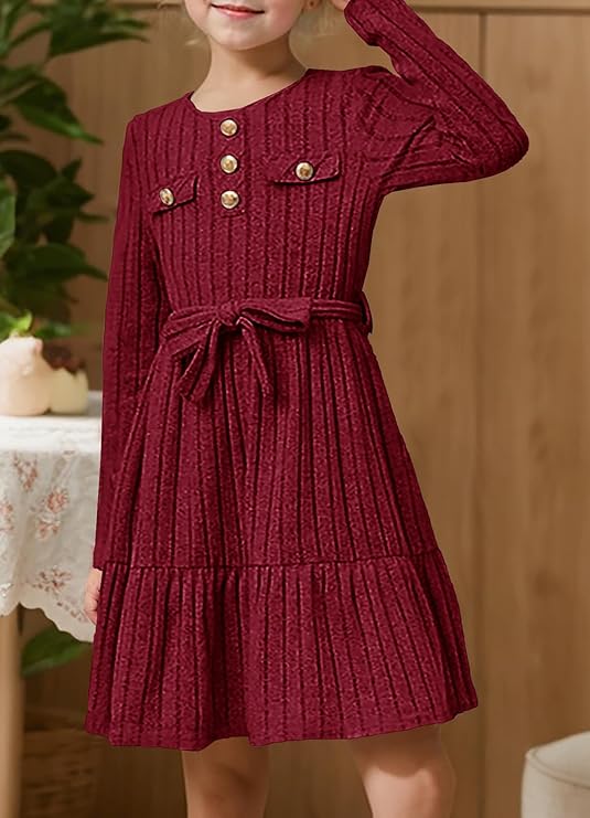 • Design: Girls knit sweater dress features a decorative button front, solid color, round neck, long sleeve, self-tie belt, high waist, elastic waist, tiered ruffle skirt, a-line, flowy hem, knee length, two side pockets