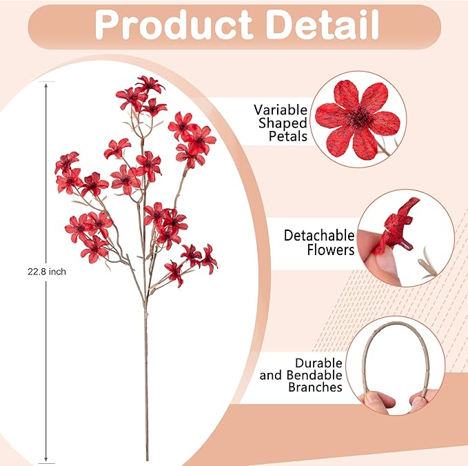 - Package & Size: There are 6 fake long stems flowers (no vase included) in one package. The artificial branches have a total length of appro 22.8inches/58cm. Full and lovely faux silk blossoms can meet your decorative needs