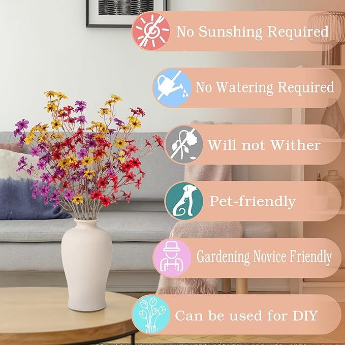 - Multiple Uses: Decorating your vase with artificial long stems fake flowers can liven up the environment. Unlike flowers, they require less maintenance, won’t wilt and won’t fade. Perfect for home wedding office hotel B&B and other indoor scenes. You can diy this craft to bring beauty and warmth to your life