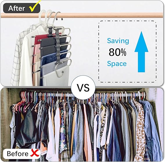 - SPACE SAVING PANTS HANGERS : 5 tier trousers hangers. Each hanger can at least hold up 5 jeans, trousers or other clothing. Maximize to save your closet space and keep it clean and orderly. Strong bearing strength and won’t be easy to be out of shape