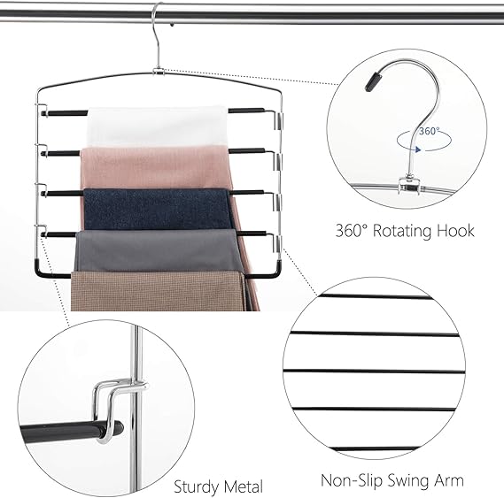 - Pants Hangers Space Saving: 5 tier trousers hangers, each space saving hanger organizer at least holds / held up much jeans, scarfs or other clothes, strong bearing strength.Save more space for your closet, keep your closet clean and orderly. It is an ideal pants hangers for women and men