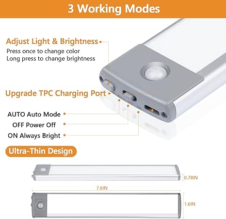 - 【Built In Large Capacity Rechargeable Battery】Our LED closet light Built-In 1000mAh rechargeable battery, USB C port can be easily fully charged in 2-3 hours and can be charged with a 5V charger, power bank, and other devices charging. rechargeable light can stay on in motion sensor mode for 14 days on a full charge, compared with other battery cabinet lights, longer standby time and no need to buy AAA batteries, energy saving and environmentally friendly.