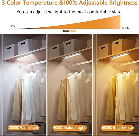 - 【3 Color Temperatures & Dimmable】 These under cabinet lights boast three color temperatures for your choosing, fulfilling diverse needs. They can bring brilliant light when it’s dark and also present soft warm light during your rest. Equipped with a wireless motion sensor, they offer convenient lighting without the need for manual operation. You can adjust the brightness at any time to meet your requirements in different environments. Choose from 2800K warm light, 4000K natural light, and 6000K bright white, with brightness ranging from 10% to 100%.
