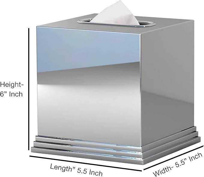 - MADE OF PREMIUM Stainless Steel and Rust resistant Aluminum with a strong chrome plating, this beautifully hand-polished Square Tissue Holder fits a large variety of Square Tissue Box brands. Generiously weighted and carefully crafted, this holder is a perfect addition to any luxury setting and compliments any decor.
