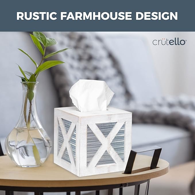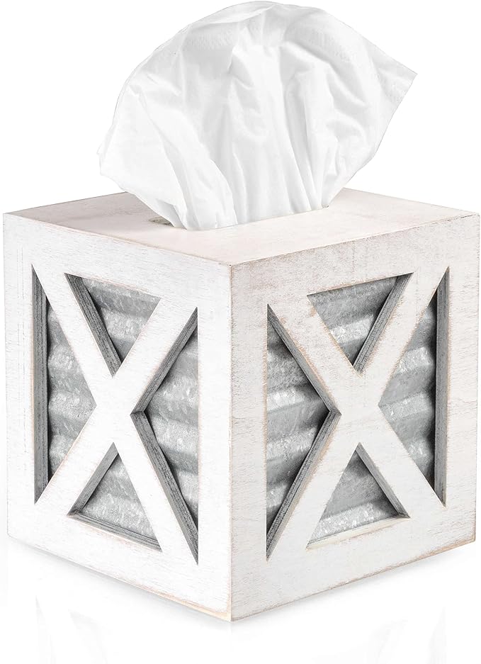- CLASSIC RUSTIC CHARM – This rustic white tissue box cover adds a touch of country charm to any room, with its galvanized sides and rustic farmhouse wood.
