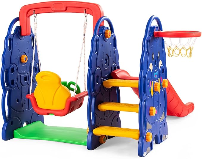 - 【4-in-1 Features】- This bright and colorful 4-in-1 playing set offers 4 functions: a smooth slide, a sturdy swing, a basketball hoop and lapping to the elephant nose, which is intended for family and domestic outdoor use. All activity elements are appropriately sized for toddlers.