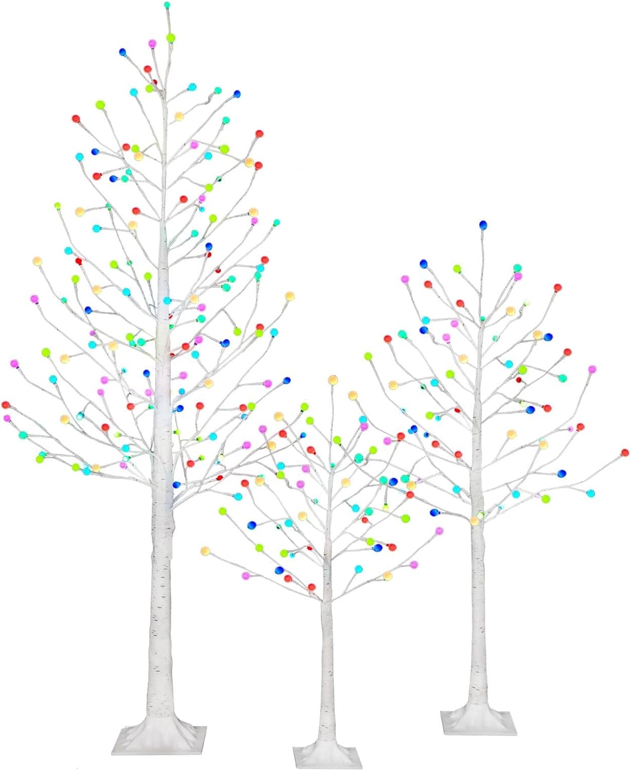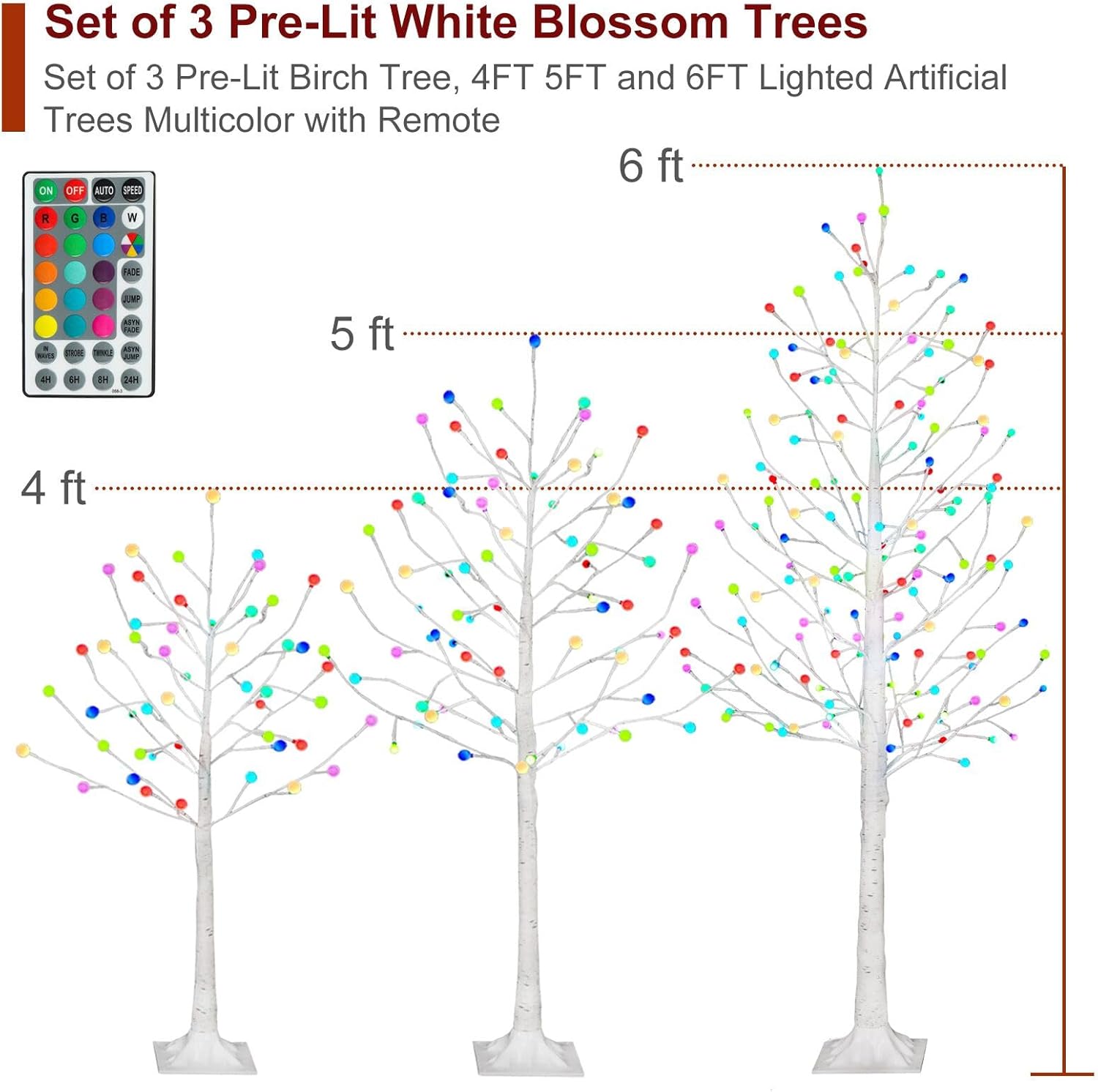 - Set of 3 Pre-lit Birch Tree is featuring a birch’s bark resembling finish and multiple LED lights, it will bring in the Christmas cheer. 4 feet includes 11 branches with 46 LEDs, 5 feet includes 20 branches with 82 LEDs, 6 feet includes 32 branches with 130 LEDs