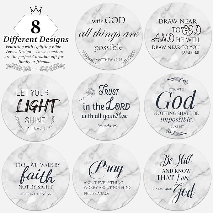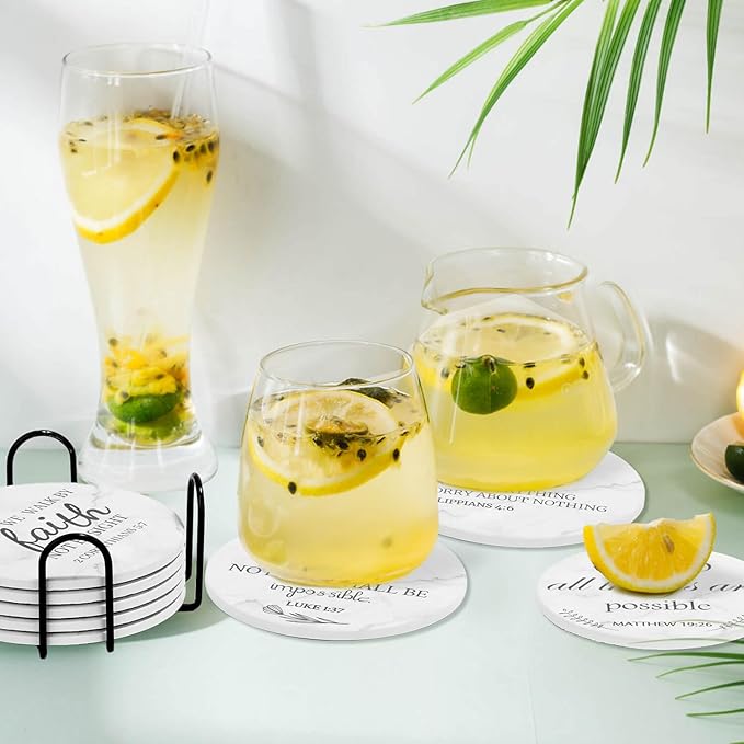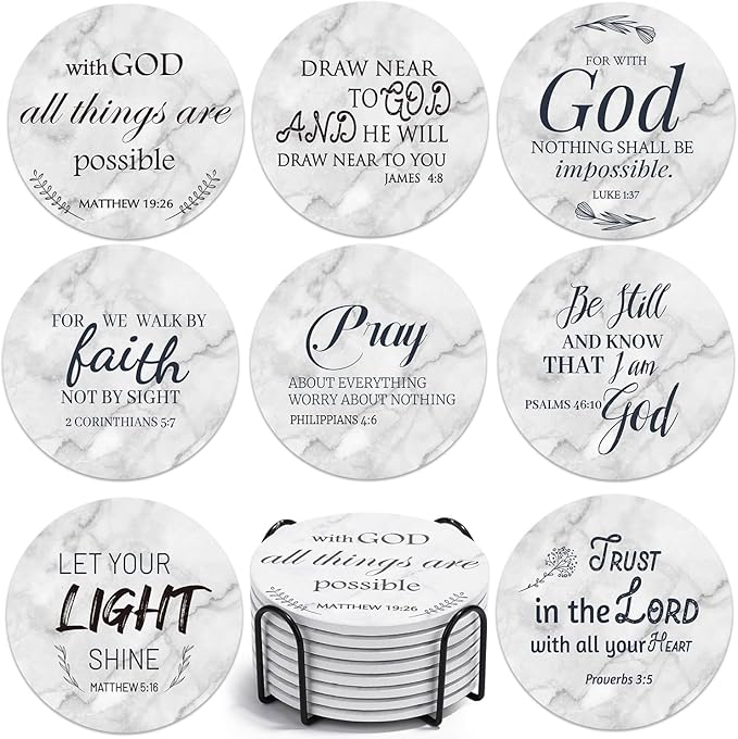 - Package including: Billbotk drink coasters set includes 8 pieces of ceramic coasters and a metal holder. Simple marble design with Bible Verses is suitable for home, office and patio table decorations. The metal holder makes the coasters convenient for storage.