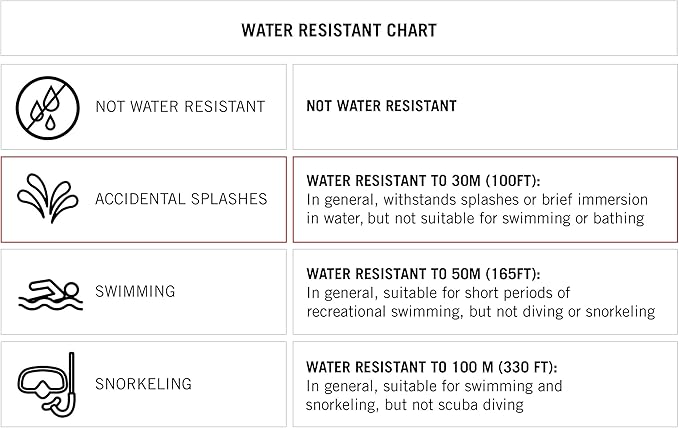 - Water resistant to 30 meters (99 feet): In general, withstands splashes or brief immersion in water, but not suitable for swimming or bathing